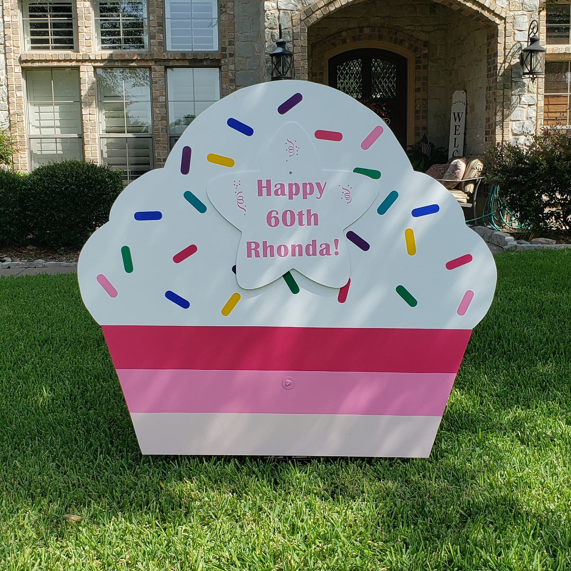 Our Cupcake Signs measure 4 feet wide by 3 1/2 feet tall. They include a personalized star with the message of your choice. Star samples include "Matthew is 2", "Maxine is 50", "Happy Birthday Judy", ... Letter color also customizable, we carry a number of different colors.