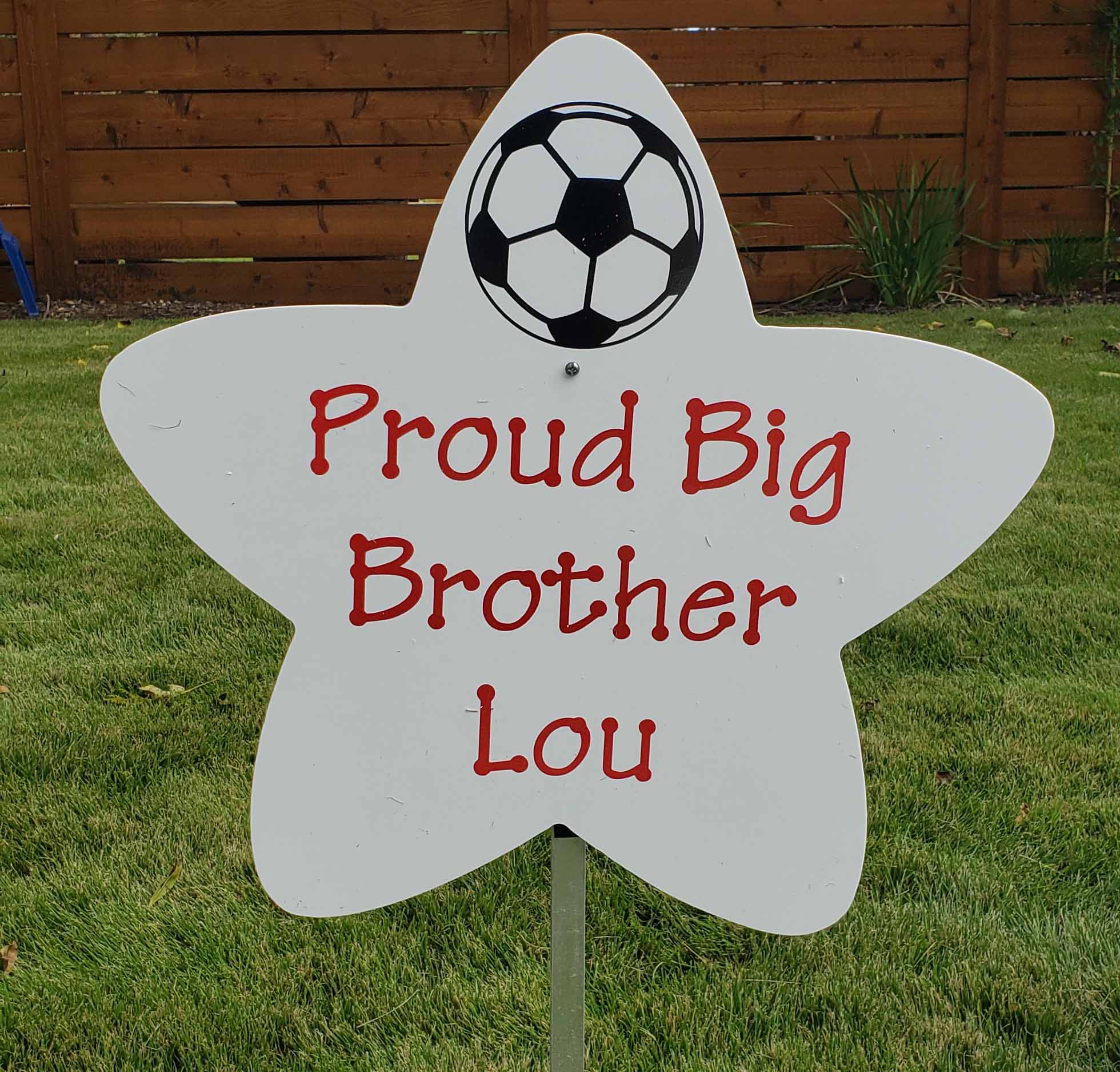 Honor the big brothers, sisters and doggers with stars of their own. We personalize these with a message like "Proud Big Brother Max", "Proud Big Sister Olivia" or "Buster Fetched a Brother". We also offer a personalized artwork piece on each one to match their interests. Boy's samples include race car, dinosour, dump truck, soccer ball, football, basketball, .... Girl's samples include Mini mouse, heart, Elsa, teddy bear... Letter colors also customizable, we carry a number of different colors.