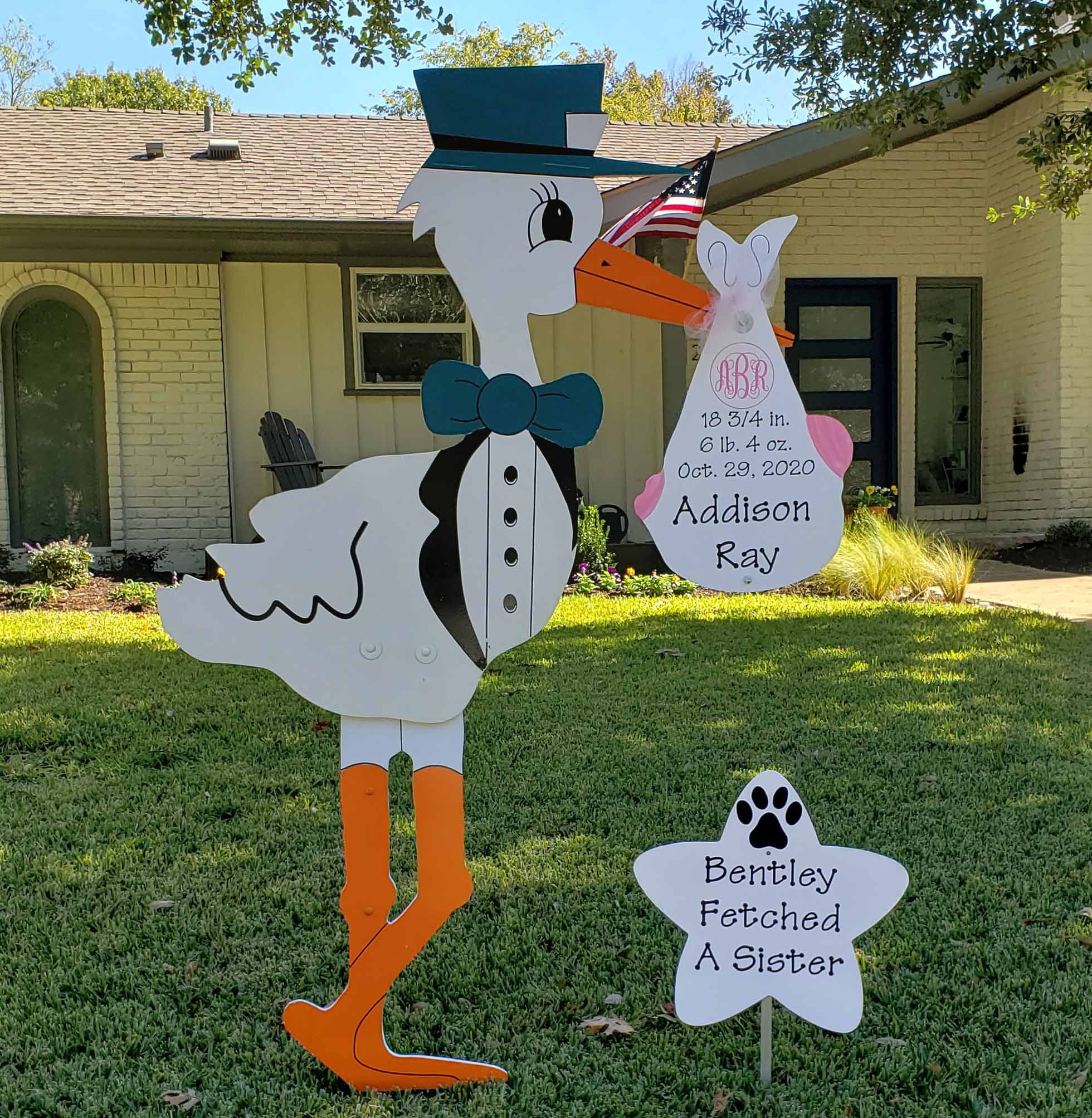 Our classic Storks are 6 foot 4 inches and tall and have been around the area the longest. We set-up the Stork with either personalized bundle wih the baby's length, weight, first & middle name, "It's A Boy or "It's A Girl!" or . We also offer an optional 5 inch monogram (pictured here) in block blue letters for boys and very curely pink letters for girls. If you want more or less information that is totally up to you.